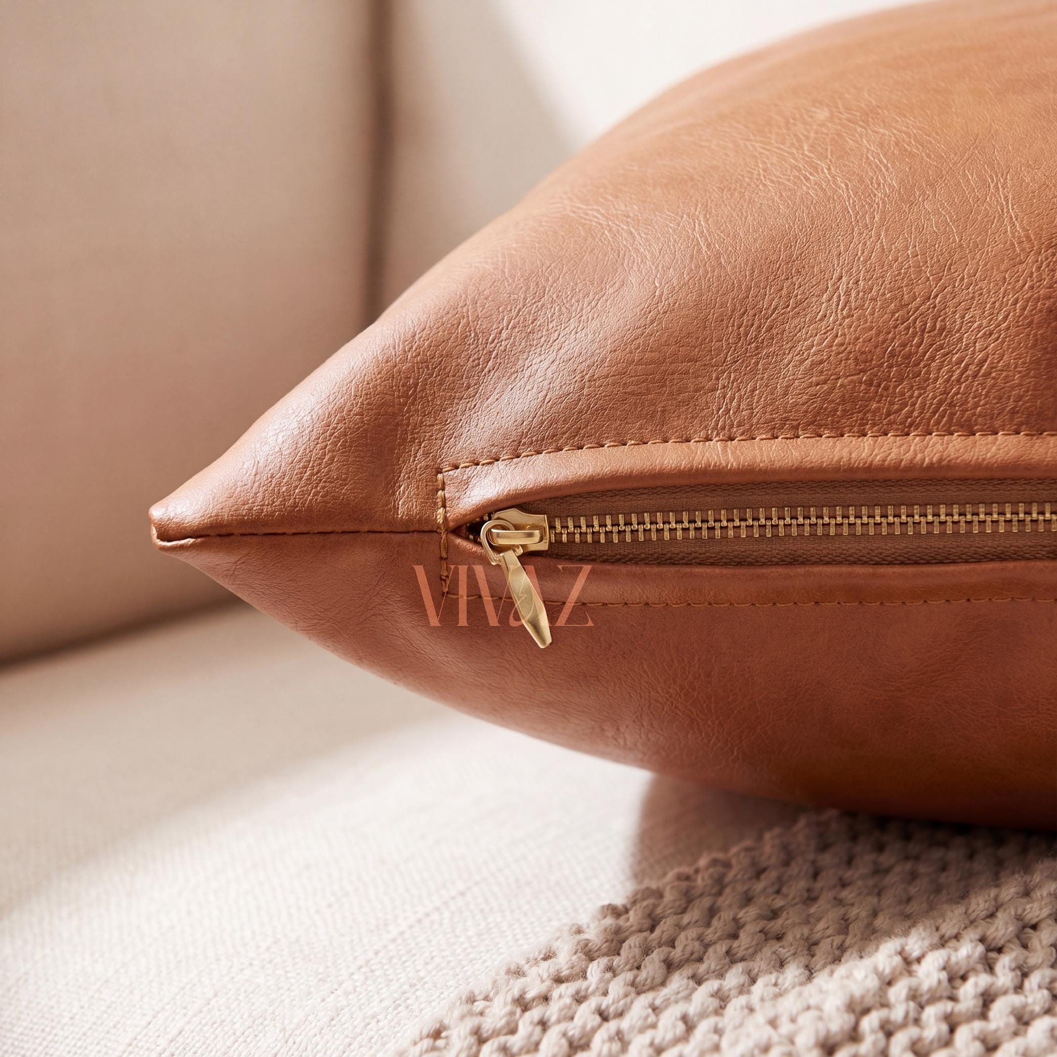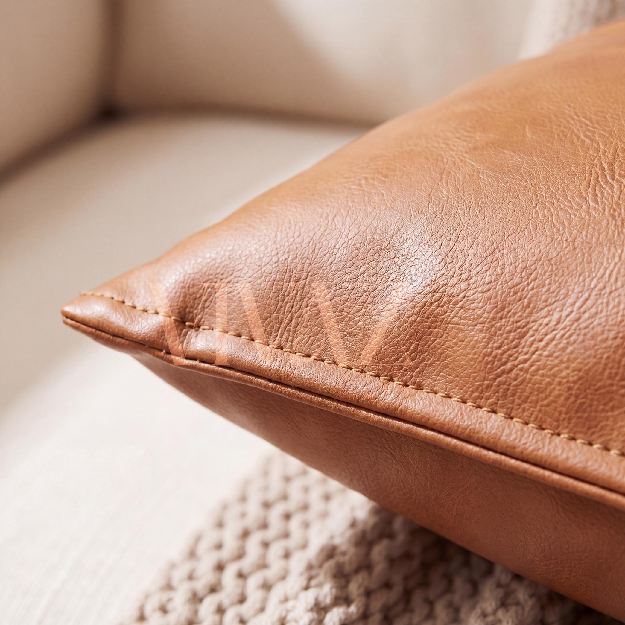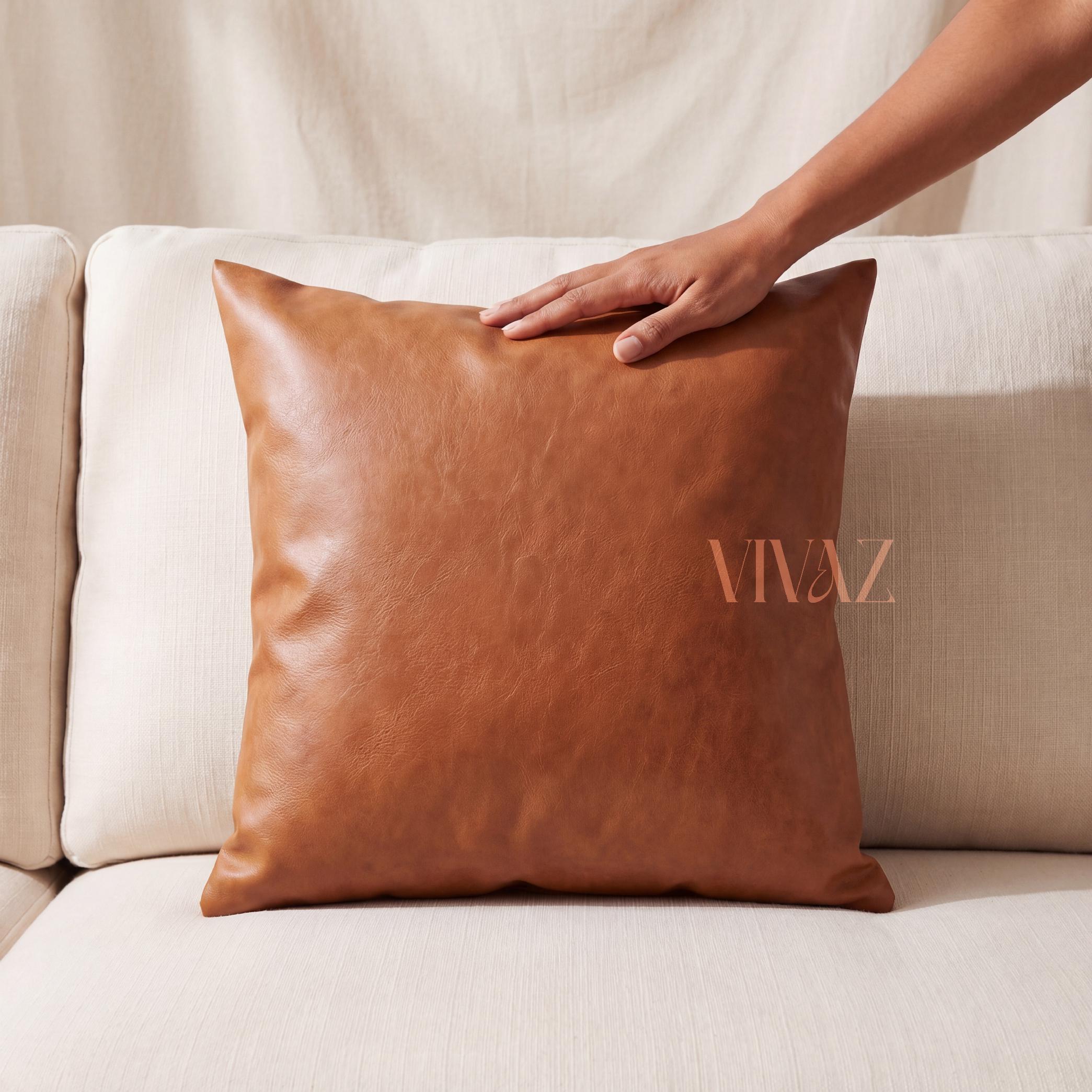 Elevate your sofa, bed, or reading nook with our handcrafted tan cognac vegan leather pillow cover. Rich texture, clean stitching, and a concealed gold zip — luxury home decor that is cruelty-free and made to last.