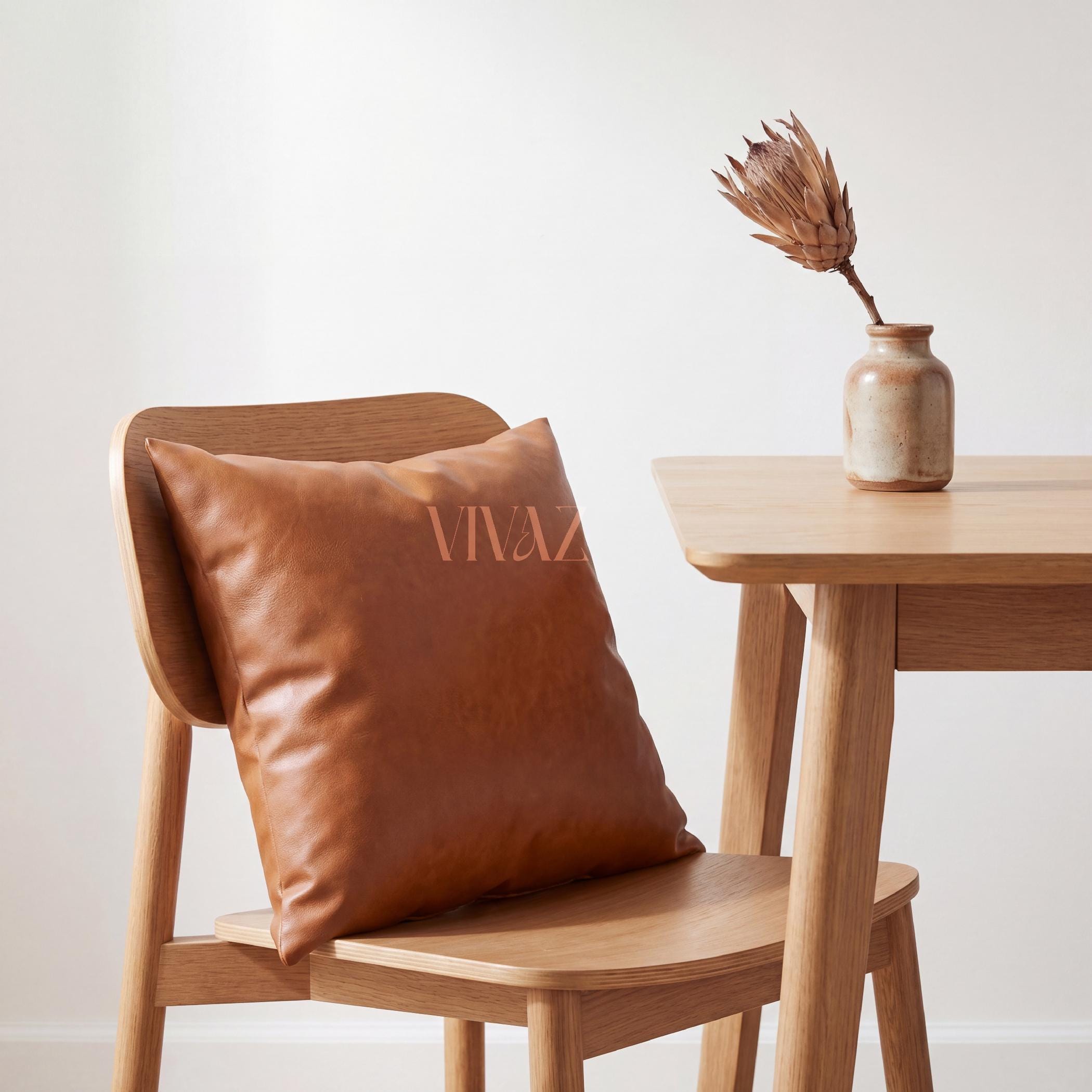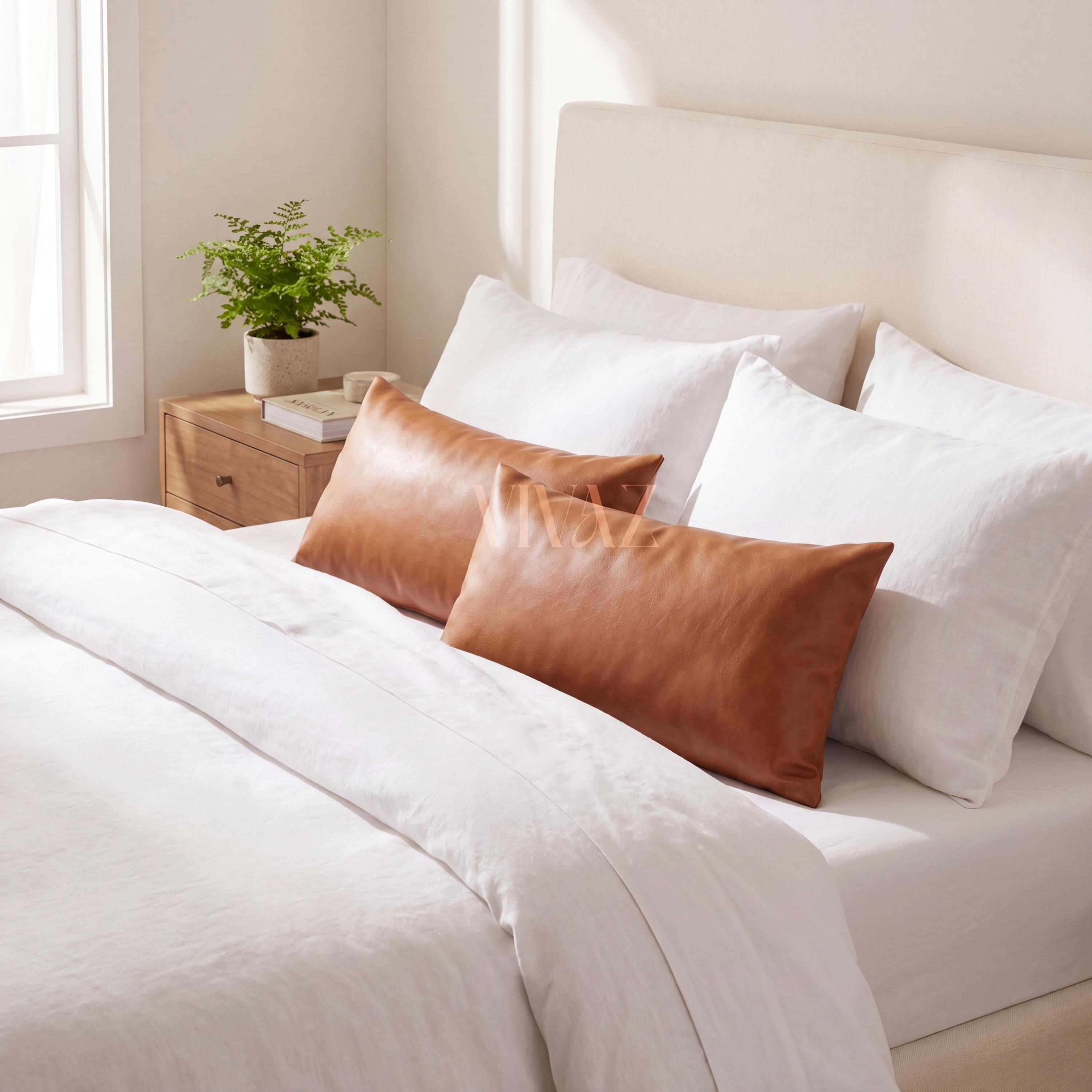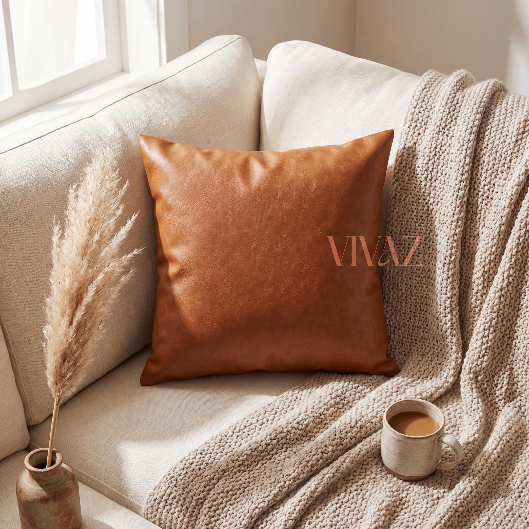 Elevate your sofa, bed, or reading nook with our handcrafted tan cognac vegan leather pillow cover. Rich texture, clean stitching, and a concealed gold zip — luxury home decor that is cruelty-free and made to last.